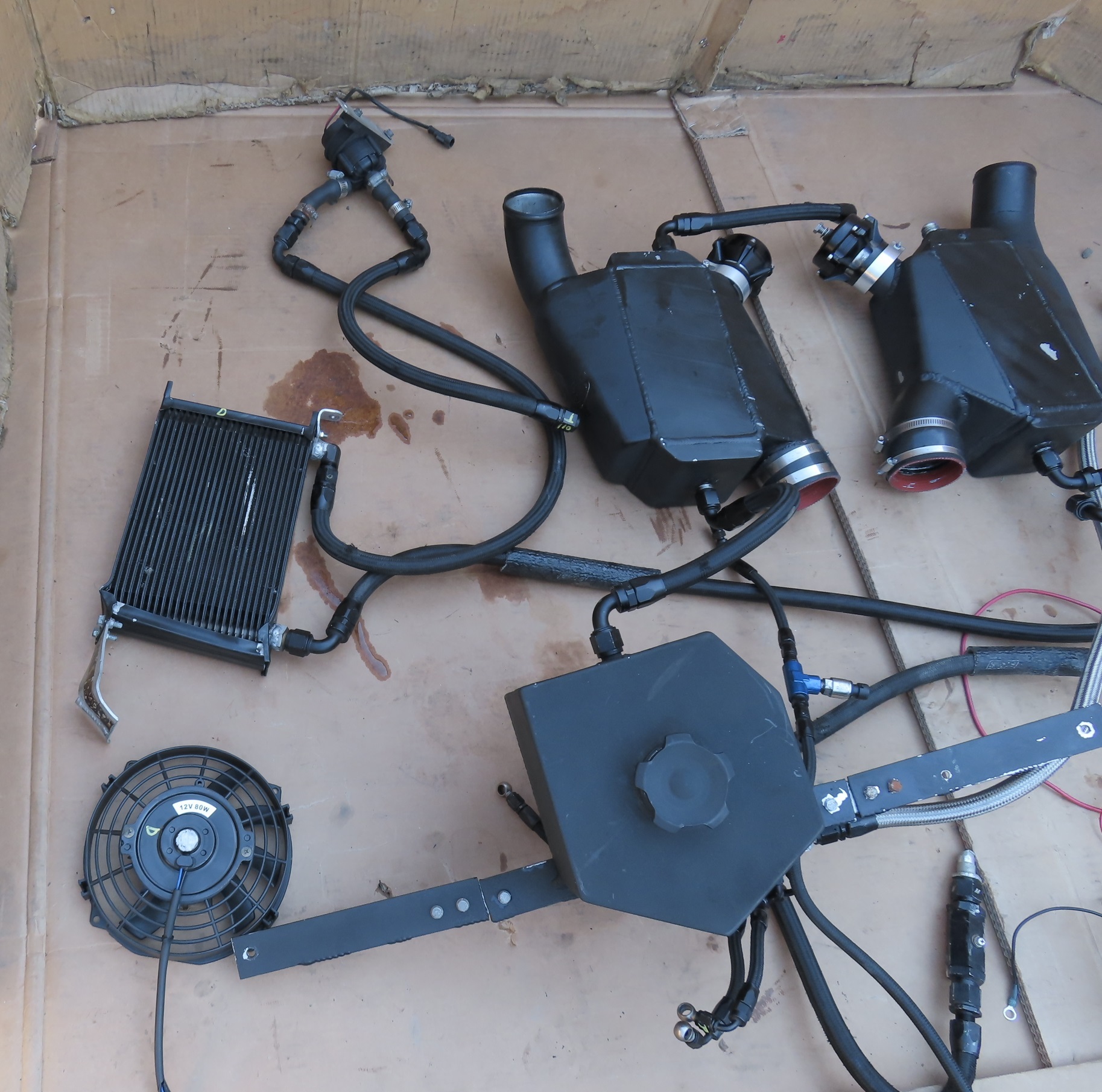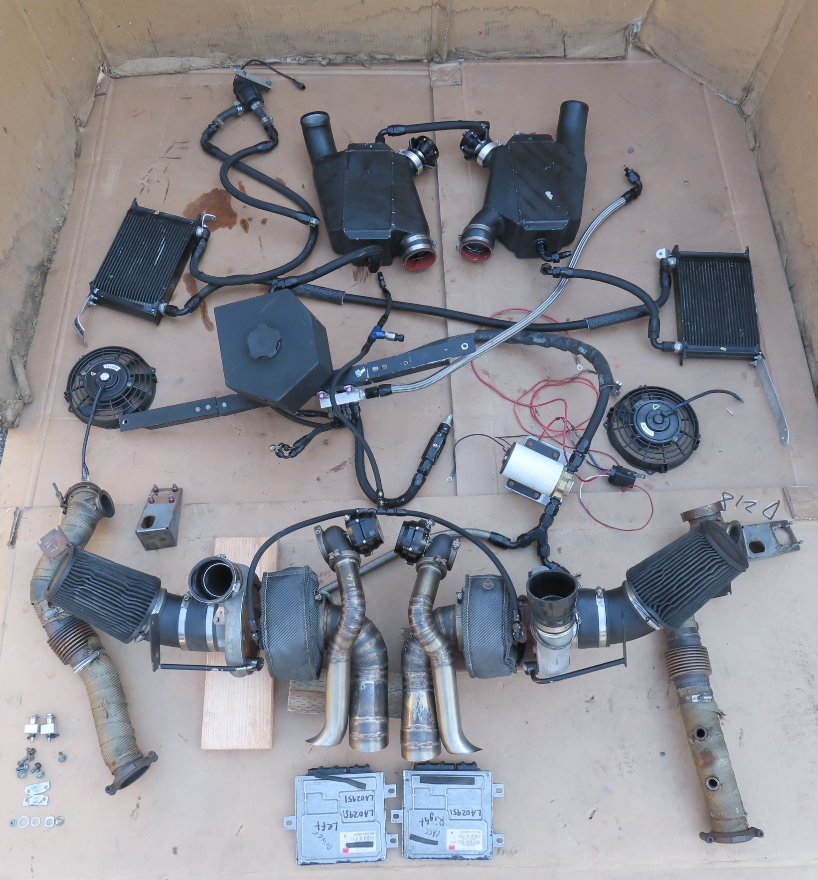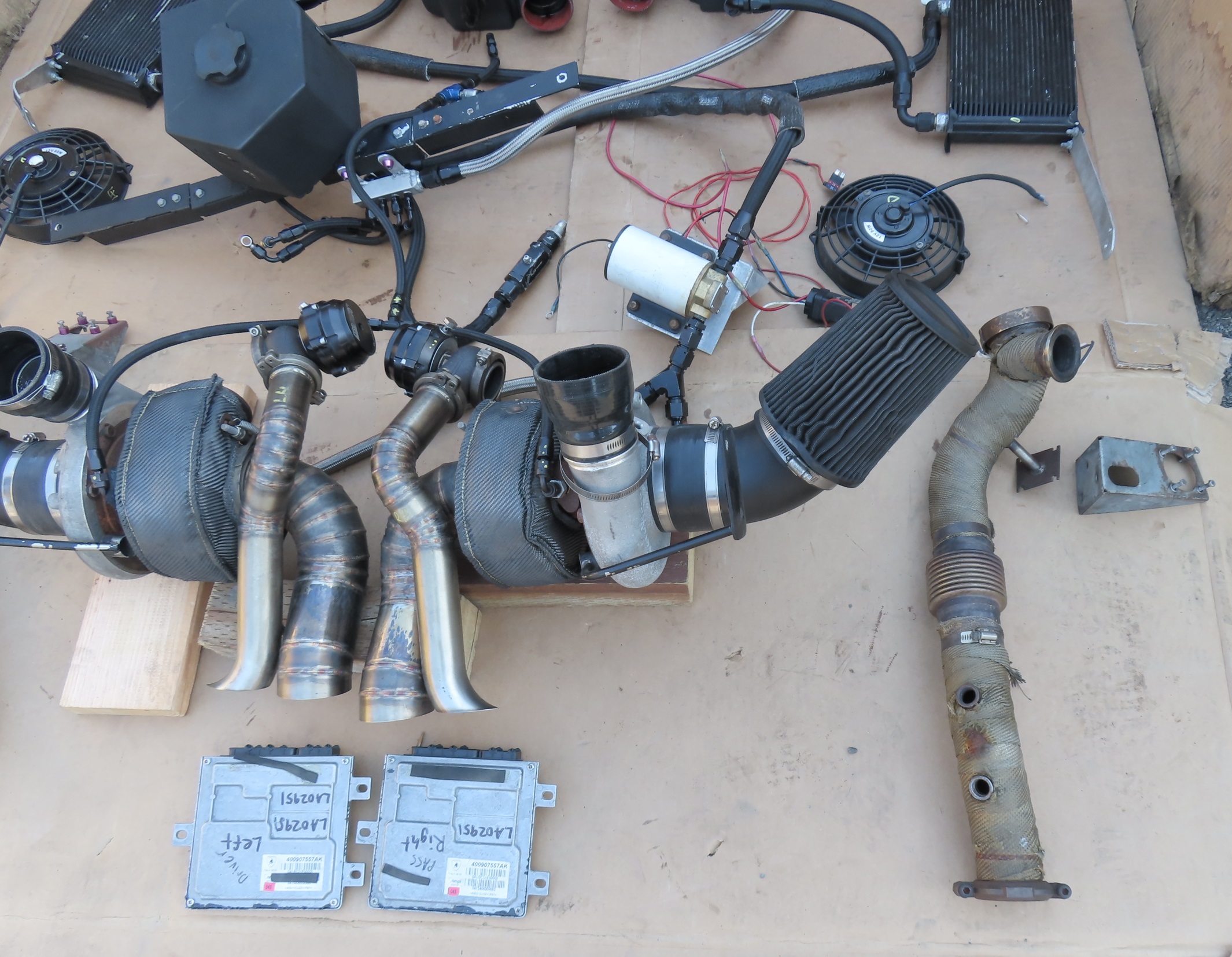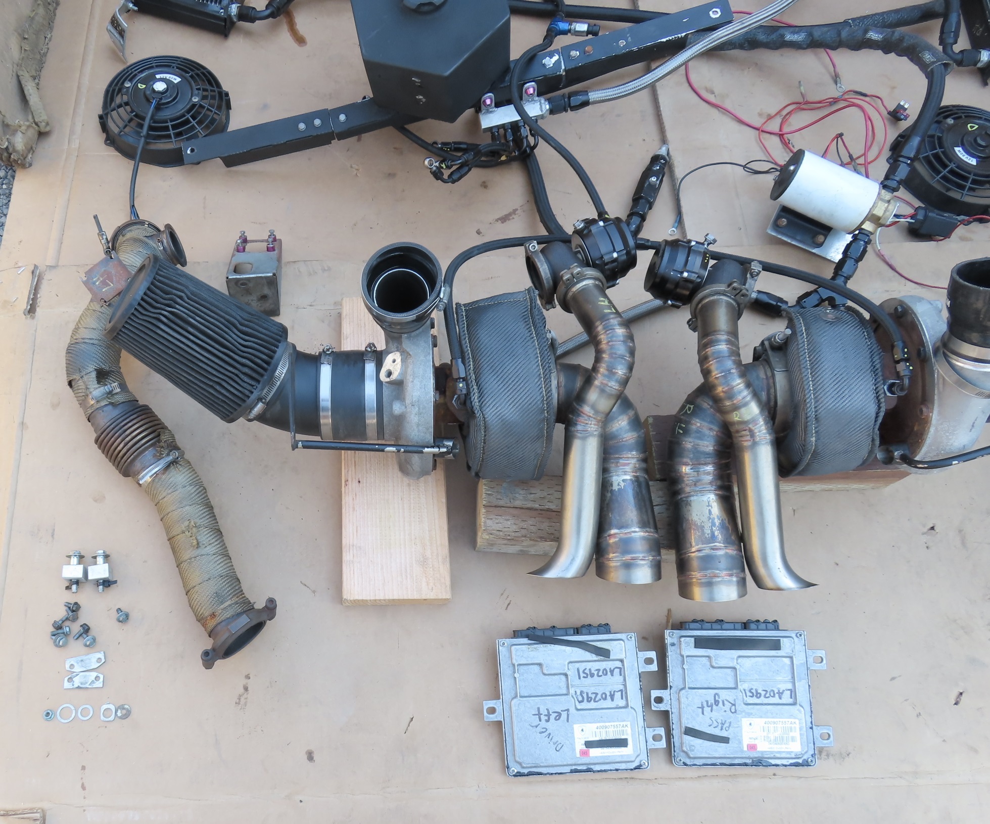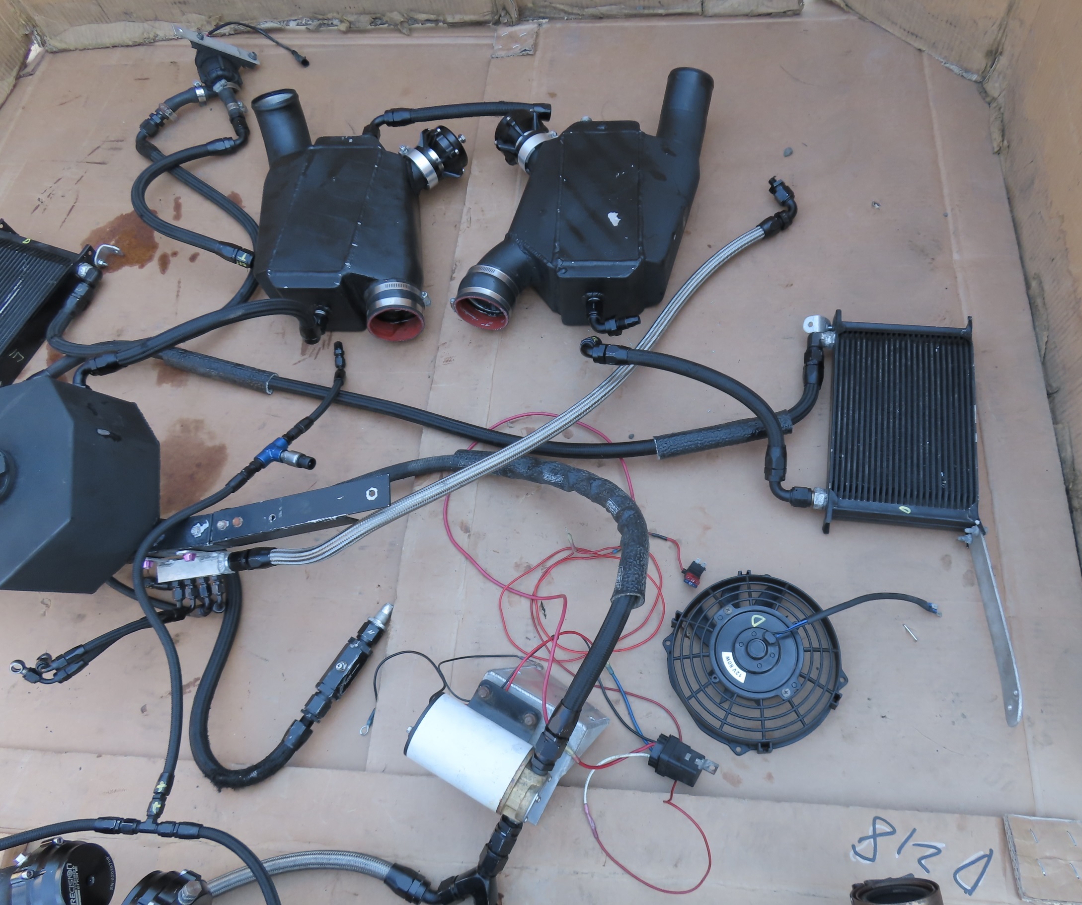 - Notes: Complete used Twin Turbo Kit, Comes from a car that started and ran without issue, video of engine running available upon request. Turbo chargers are BorgWarner S300SX, Wastegates are Precision Turbo & Engine, Blowoff valves are Tial. Kit also has a Seaflow Oil Pump. Intercoolers are water-cooled and have radiators and fans which mount in the quarter upper panels. ECU's were bench flashed and are included. (If you would like to purchase kit without ECU's this comes with a $1000 discount). Turbo charges are in great shape with no unusual play. There was some damage to the kit which includes: 1 radiator for the intercoolers is damaged (needs replacement). Both fans from the radiators are broken, and there is 1 water line that was damaged and a fitting on the end of it was damage. We never figured out where that line went and assue it was just a drain line for the water tank. Exhaust is straight out of the turbo chargers and is Stainless steel. We were unable to find out who built this kit, but it seems well built with top end brands.